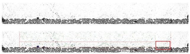 Inclusions within the analysis range are indicated in blue. The upper image shows a sample with many inclusions, and the lower image shows a clean sample.